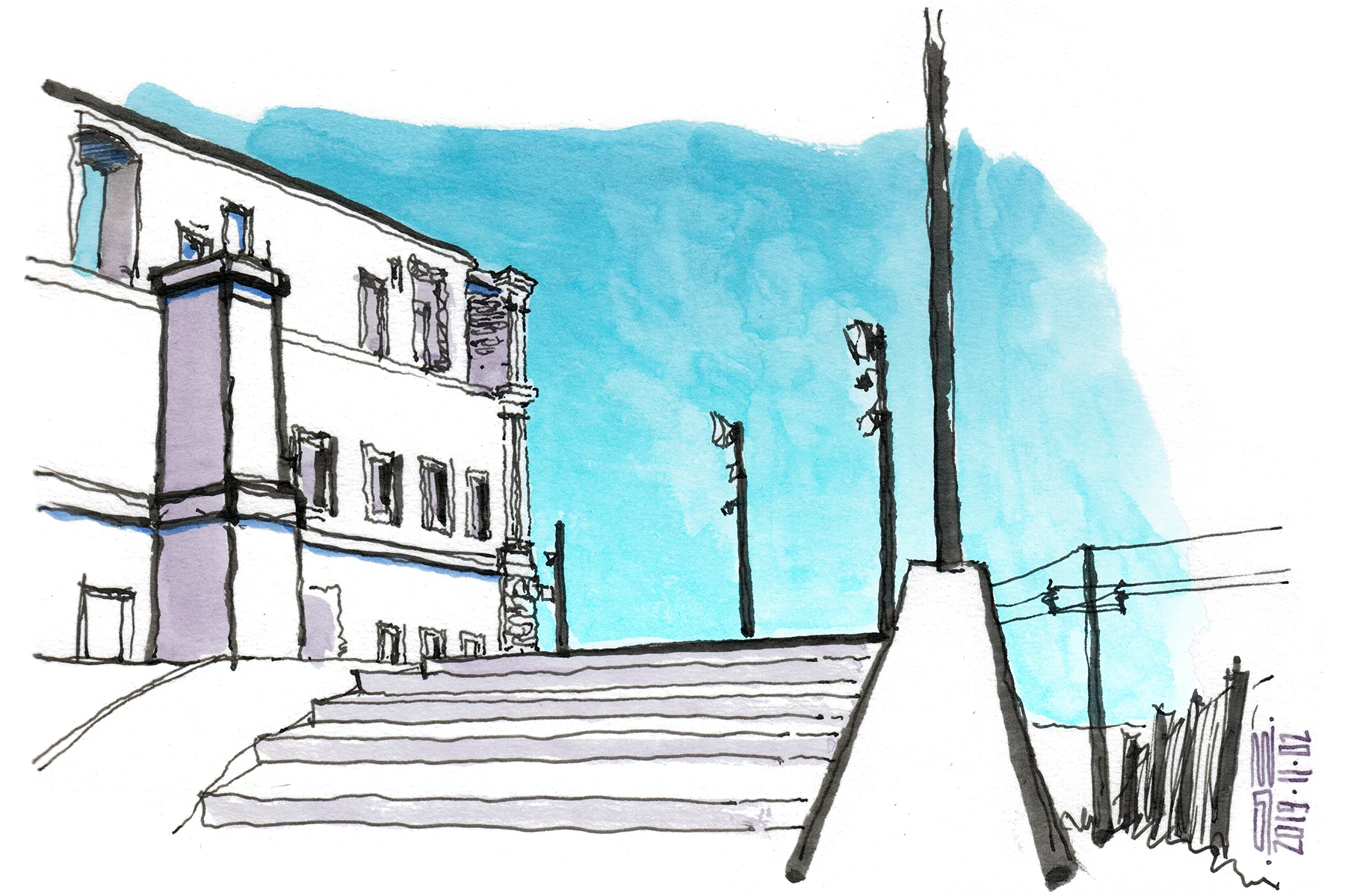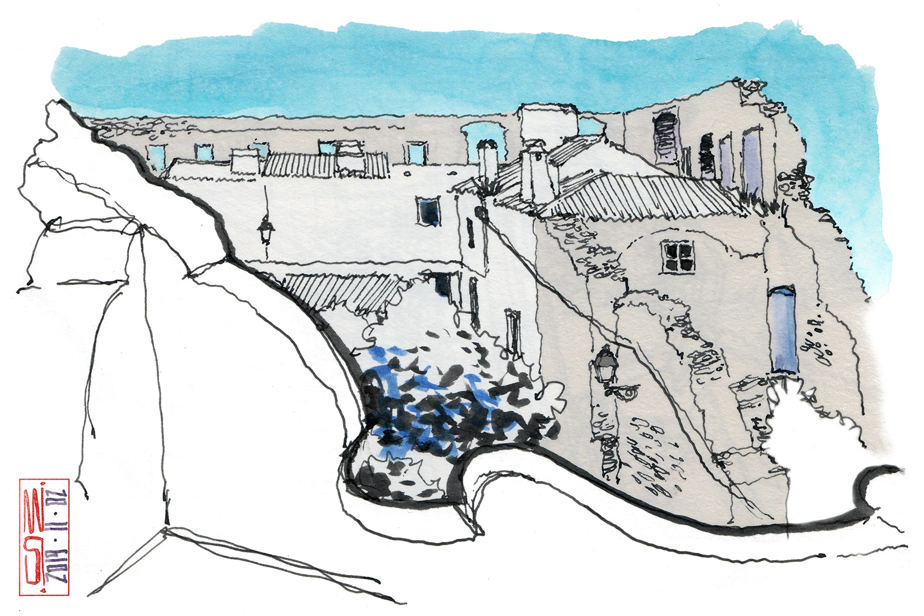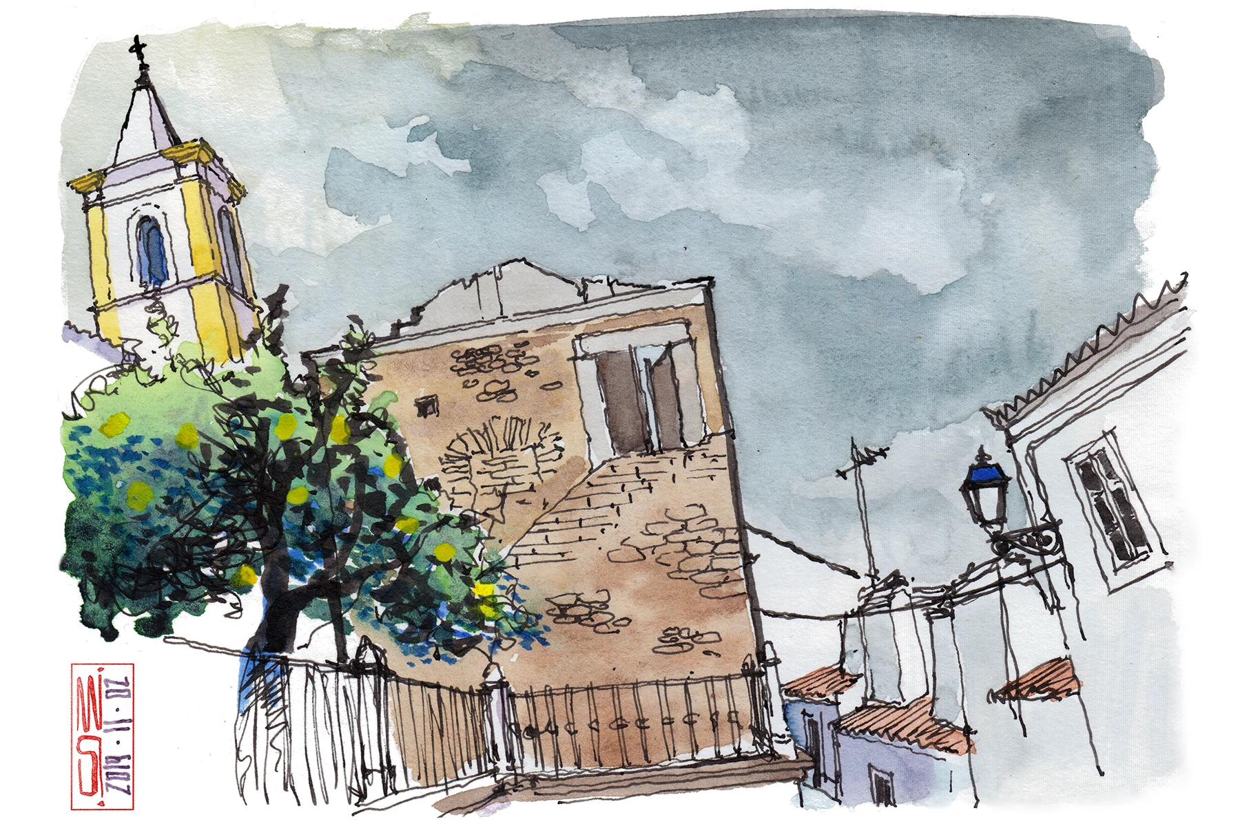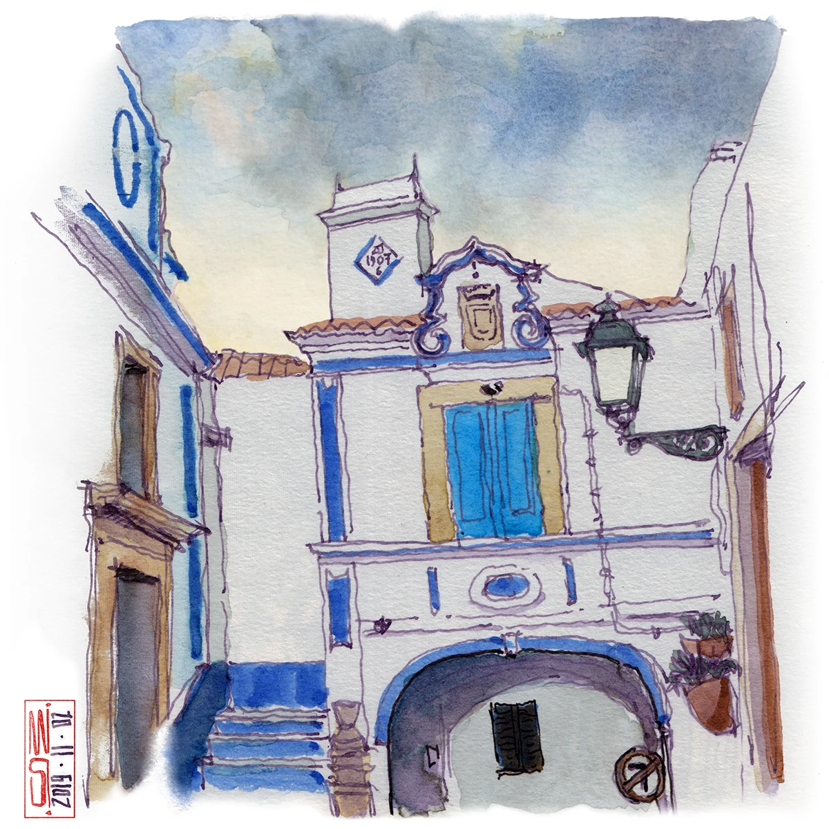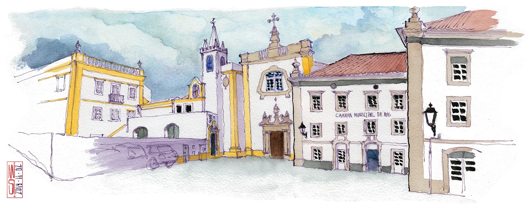 Situada no norte do Alentejo, Avis desenvolveu-se a partir do castelo fundado pela Ordem de Avis no século XIII. O traçado medieval, as torres e os troços de muralha ainda visíveis recordam a importância estratégica da vila na defesa do território. O desenho regista essa herança, marcada pela relação entre a arquitetura militar e a paisagem alentejana.