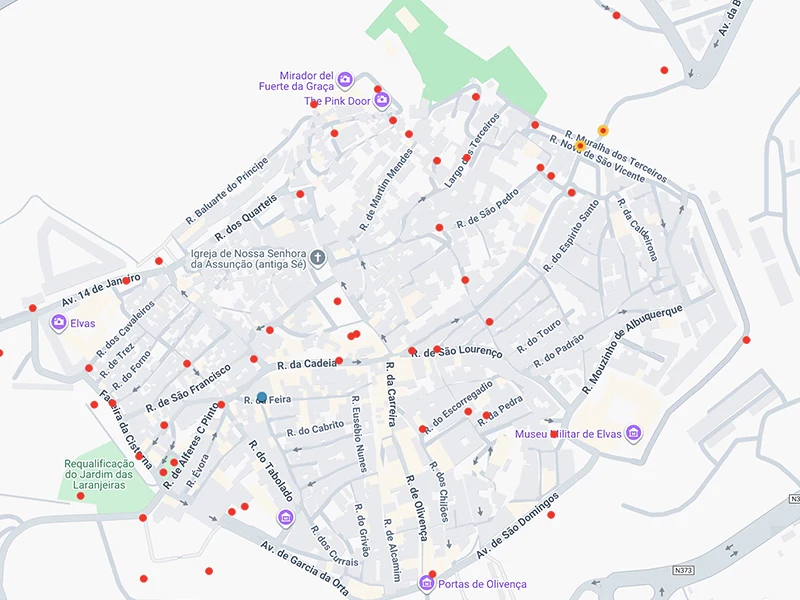As igrejas de Elvas distribuem-se entre o interior da cerca histórica e a sua periferia, acompanhando o crescimento da cidade para além das muralhas.