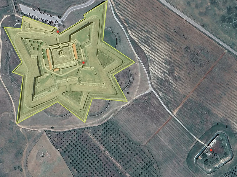 O Forte da Graça ergue-se no alto do Monte da Graça como a peça culminante do sistema defensivo de Elvas. Construído no século XVIII, domina o território circundante com uma presença imponente, fruto de uma conceção militar madura, onde estratégia, geometria e paisagem se articulam com precisão. A sua complexa organização interna, de praças, baluartes e caminhos cobertos, traduz um desenho pensado para o controlo total do horizonte. A altitude amplifica a relação com o espaço envolvente, fazendo do forte não apenas um elemento defensivo, mas um ponto de leitura do território. Nos meus desenhos, o Forte da Graça surge como um lugar de distância e domínio — uma arquitetura que observa de longe, onde a memória da guerra se transforma numa experiência de silêncio e permanência.