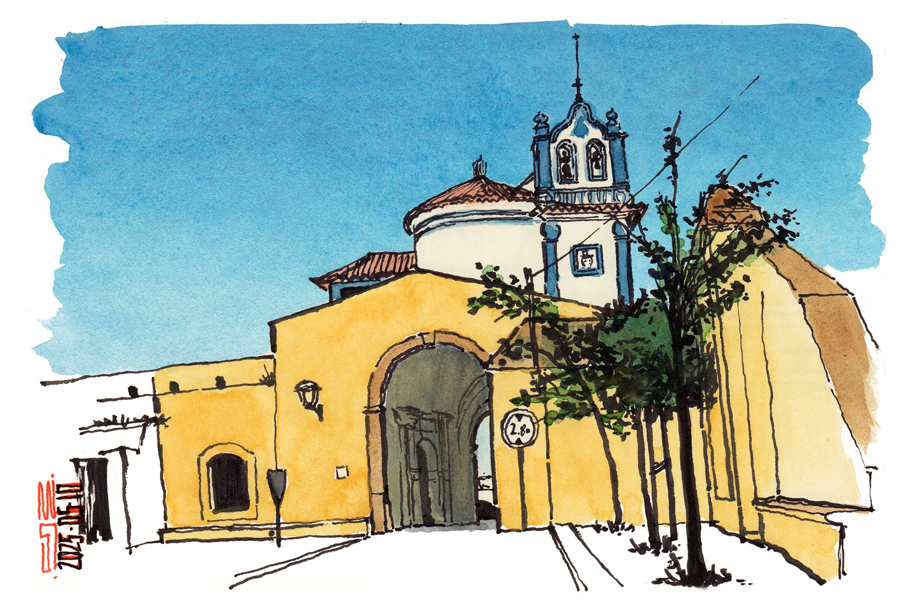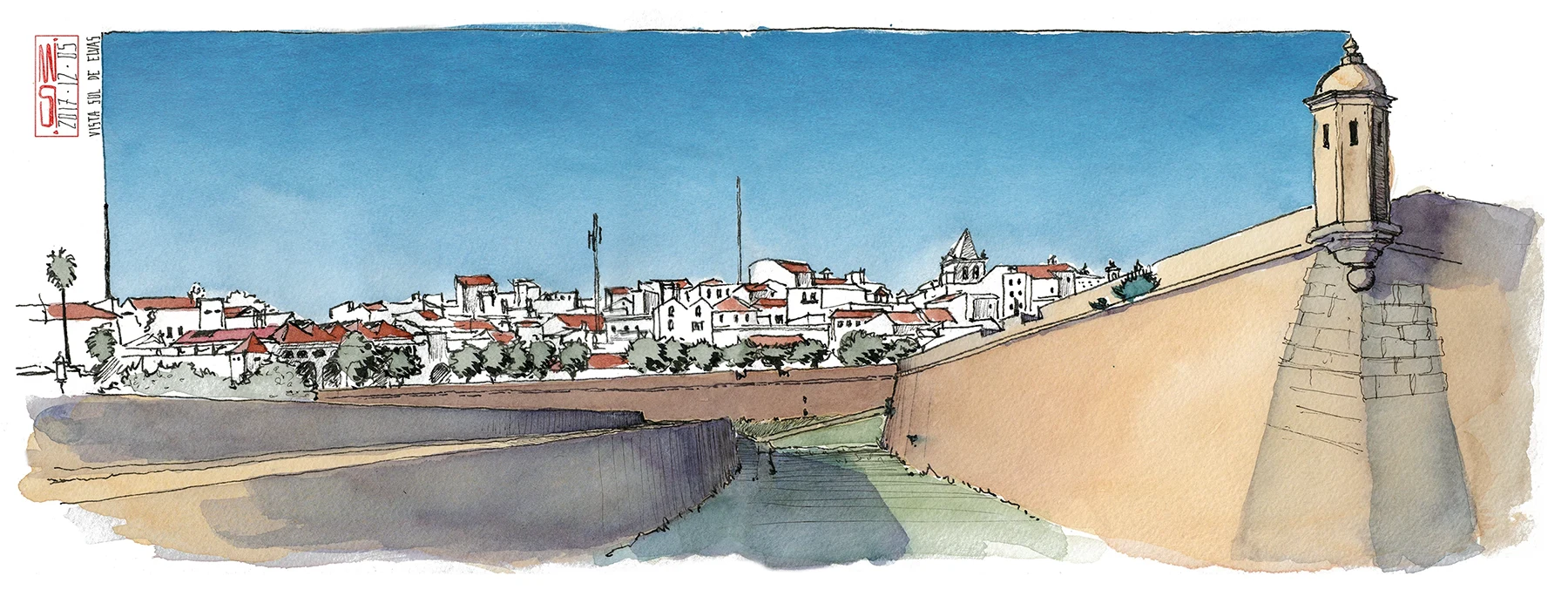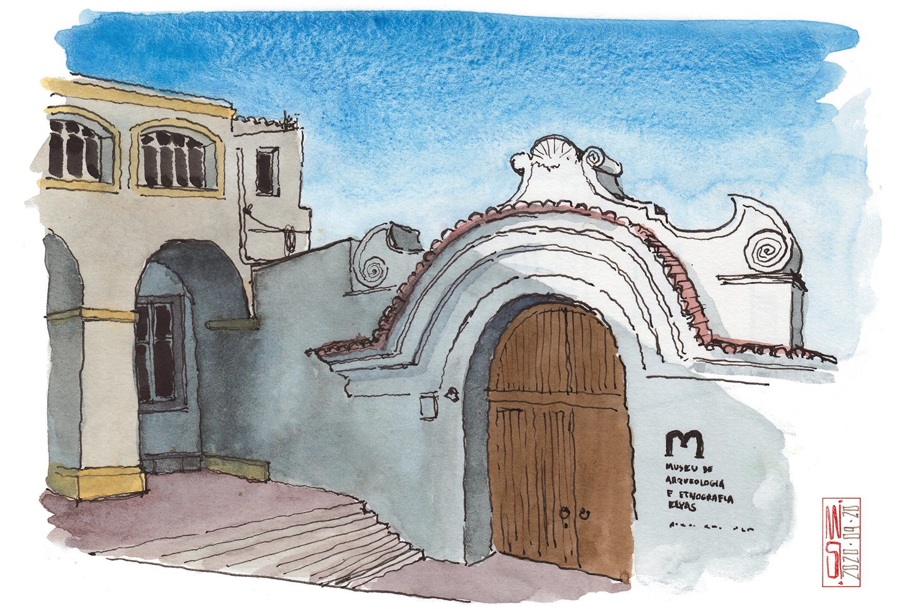 No centro histórico de Elvas, as ruas estreitas e os largos irregulares parecem nascer mais do tempo do que de um plano. Caminha-se por um tecido urbano onde cada inflexão da calçada responde à topografia, à sombra projetada pelas casas, à memória de usos sucessivos. As fachadas, gastas e recompostas, alinham-se num equilíbrio imperfeito: varandas de ferro, cantarias reaproveitadas, rebocos desiguais onde a luz insiste em revelar camadas. Desenhar aqui é acompanhar o ritmo pausado do lugar, deixar que o traço siga o declive da rua ou o silêncio suspenso de um largo inesperado.