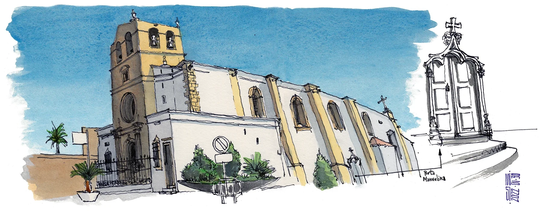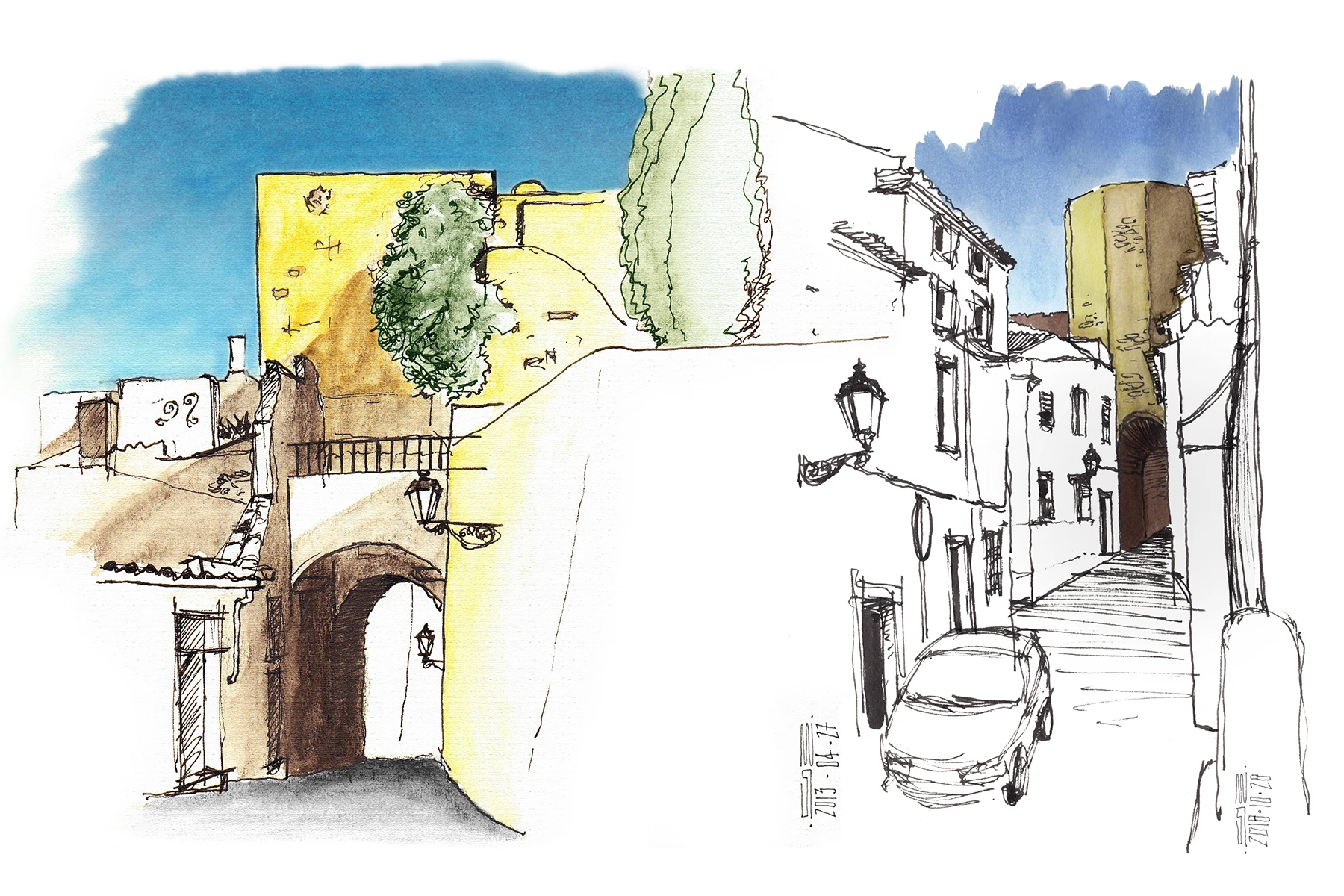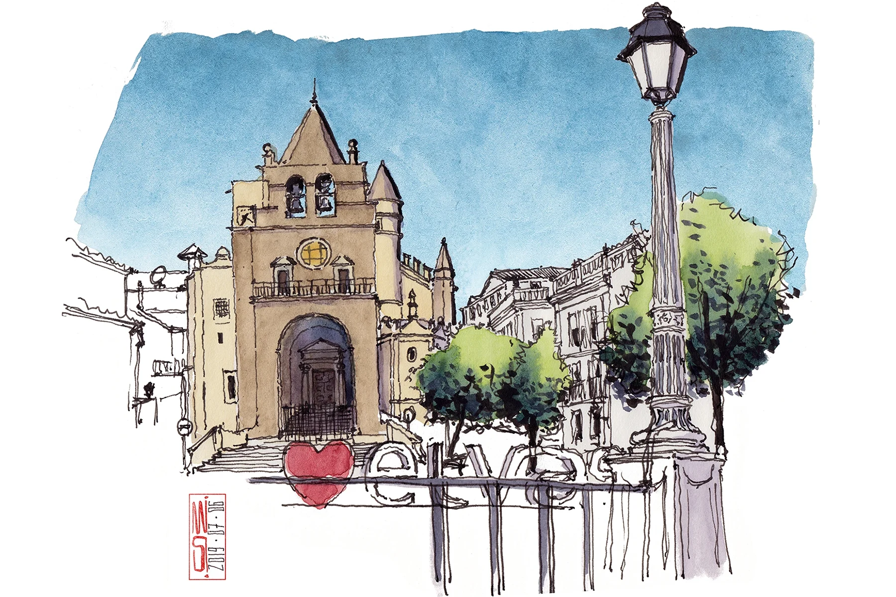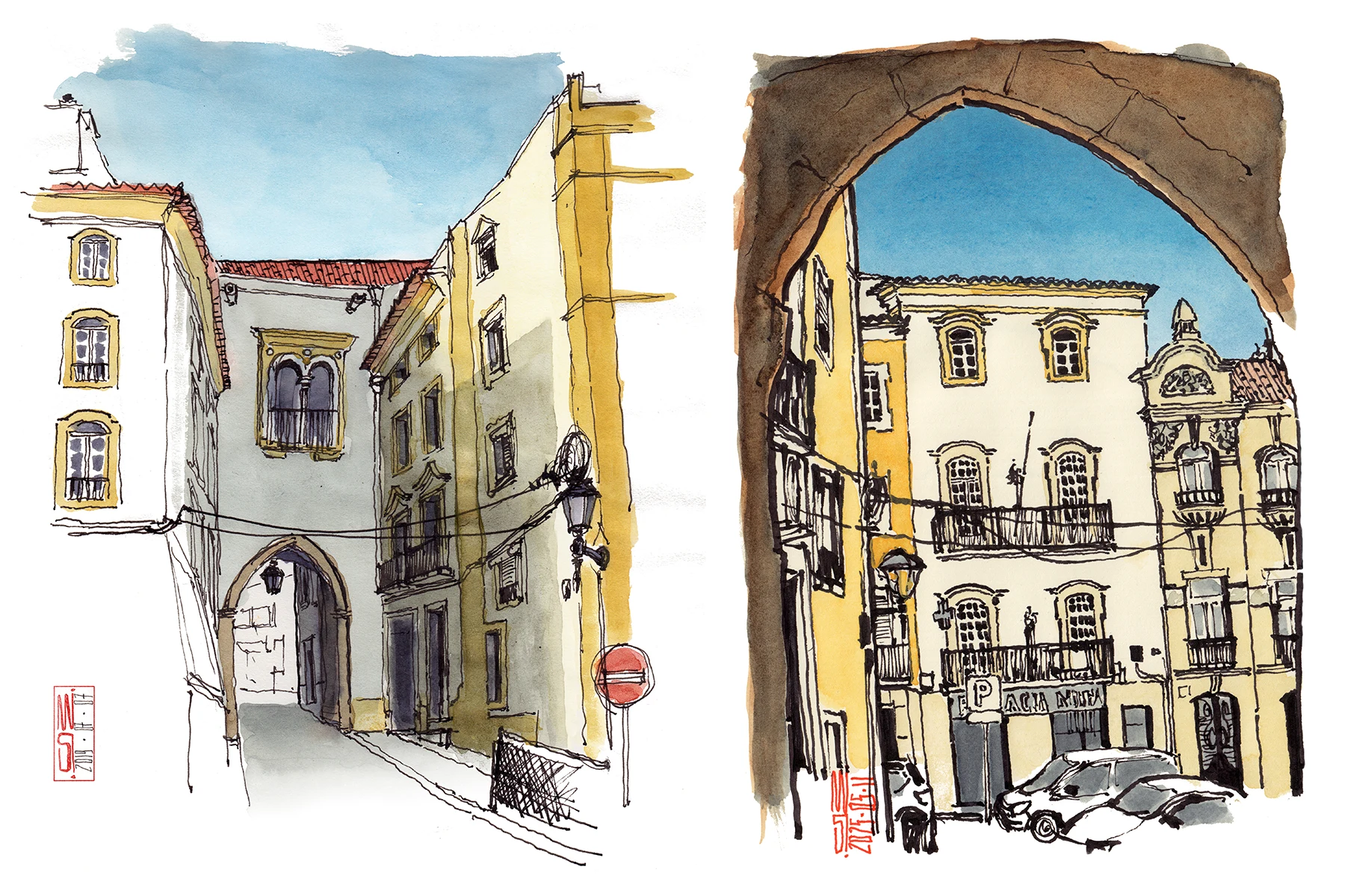 No centro histórico de Elvas, as ruas estreitas e os largos irregulares parecem nascer mais do tempo do que de um plano. Caminha-se por um tecido urbano onde cada inflexão da calçada responde à topografia, à sombra projetada pelas casas, à memória de usos sucessivos. As fachadas, gastas e recompostas, alinham-se num equilíbrio imperfeito: varandas de ferro, cantarias reaproveitadas, rebocos desiguais onde a luz insiste em revelar camadas. Desenhar aqui é acompanhar o ritmo pausado do lugar, deixar que o traço siga o declive da rua ou o silêncio suspenso de um largo inesperado.
