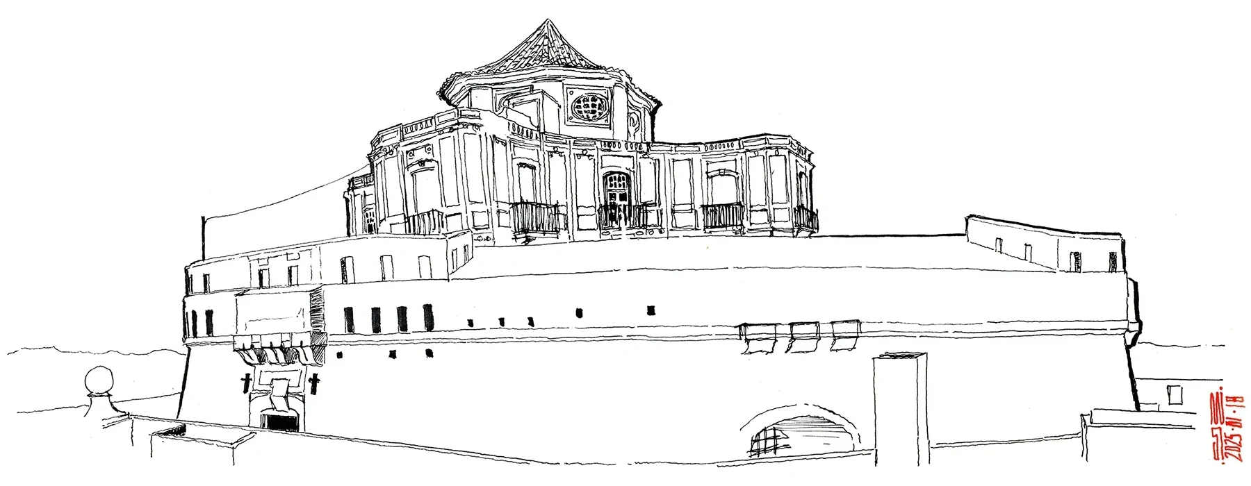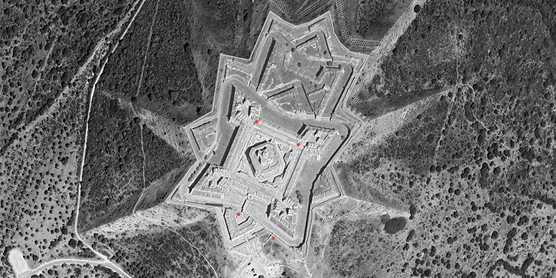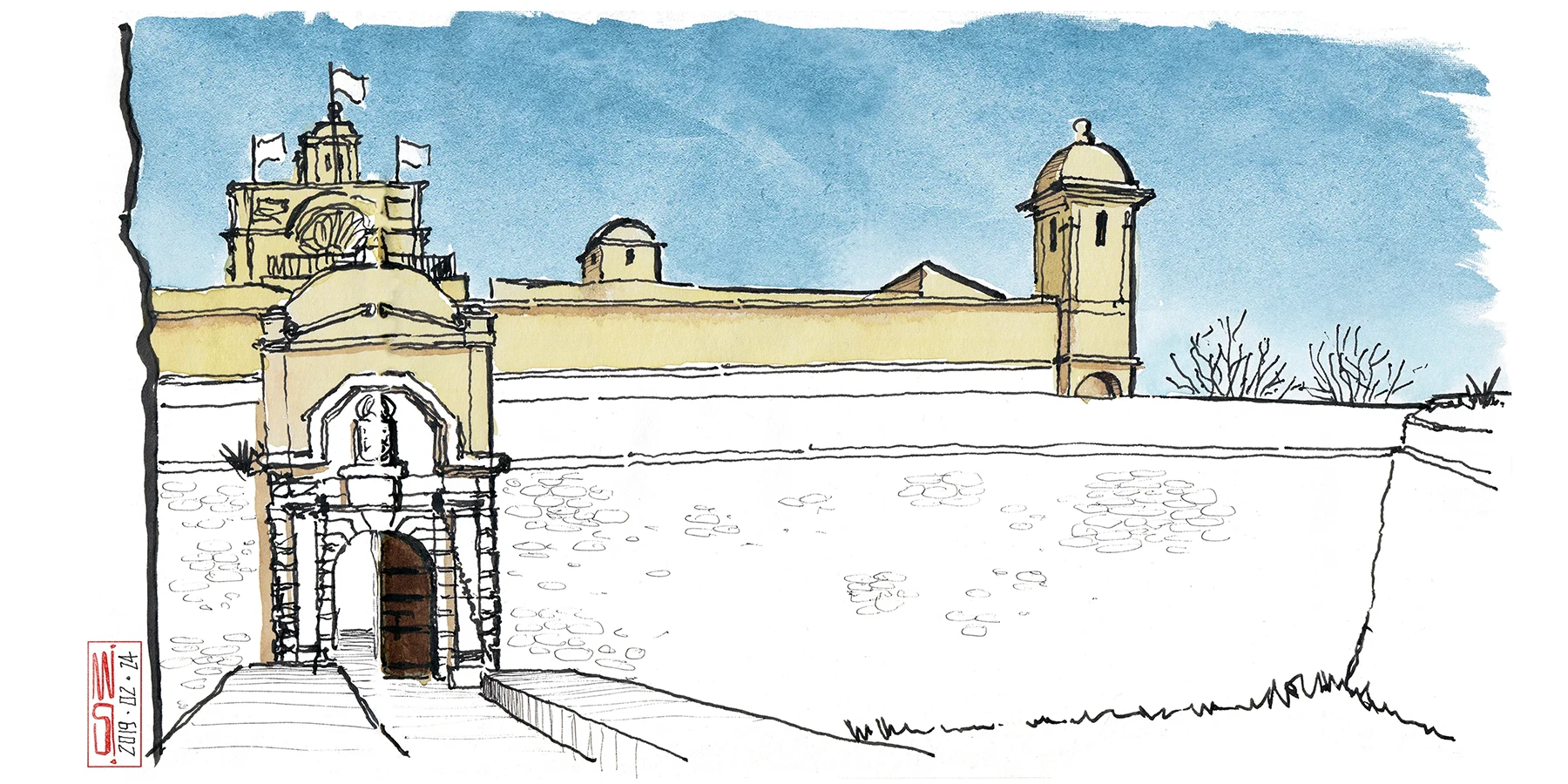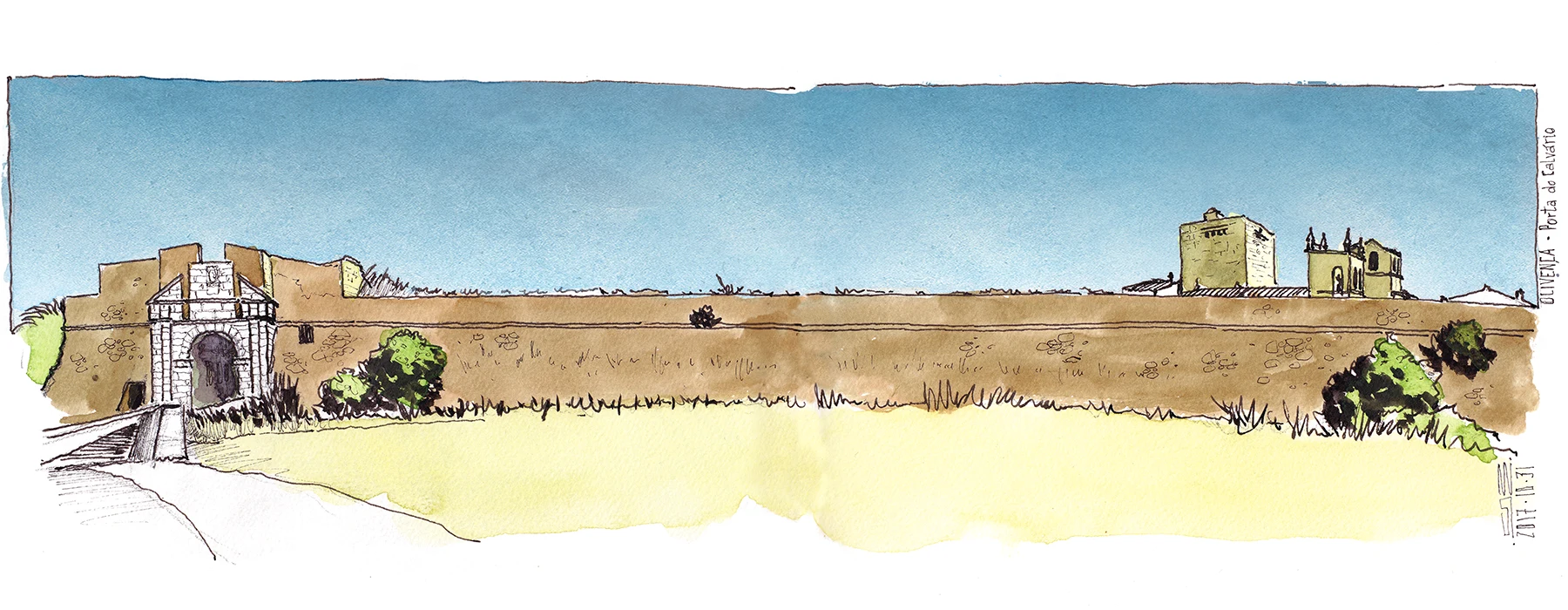 O Forte da Graça ergue-se no alto do Monte da Graça como a peça culminante do sistema defensivo de Elvas. Construído no século XVIII, domina o território circundante com uma presença imponente, fruto de uma conceção militar madura, onde estratégia, geometria e paisagem se articulam com precisão. A sua complexa organização interna, de praças, baluartes e caminhos cobertos, traduz um desenho pensado para o controlo total do horizonte. A altitude amplifica a relação com o espaço envolvente, fazendo do forte não apenas um elemento defensivo, mas um ponto de leitura do território. Nos meus desenhos, o Forte da Graça surge como um lugar de distância e domínio — uma arquitetura que observa de longe, onde a memória da guerra se transforma numa experiência de silêncio e permanência.