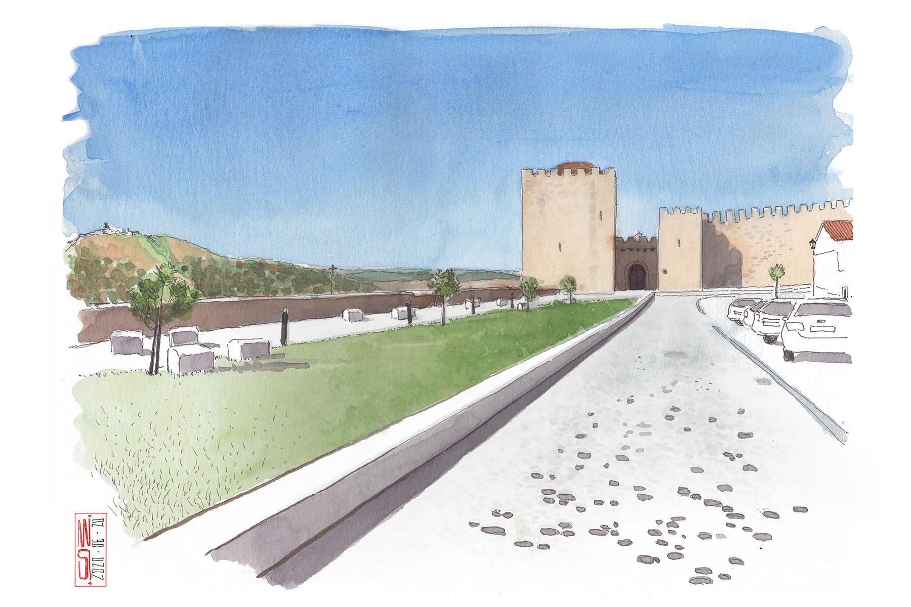 Em Olivença, a muralha apresenta-se como um sistema contínuo de contenção e vigilância, marcado por sucessivas camadas históricas que reflectem a sua importância estratégica ao longo dos séculos. Reforçada sobretudo entre os séculos XIV e XVI, num território de fronteira instável, a fortificação revela uma arquitectura adaptada à artilharia, onde a massa e a espessura substituem o gesto decorativo, ainda que subsistam elementos associados ao período manuelino, visíveis na transição entre função militar e afirmação simbólica.