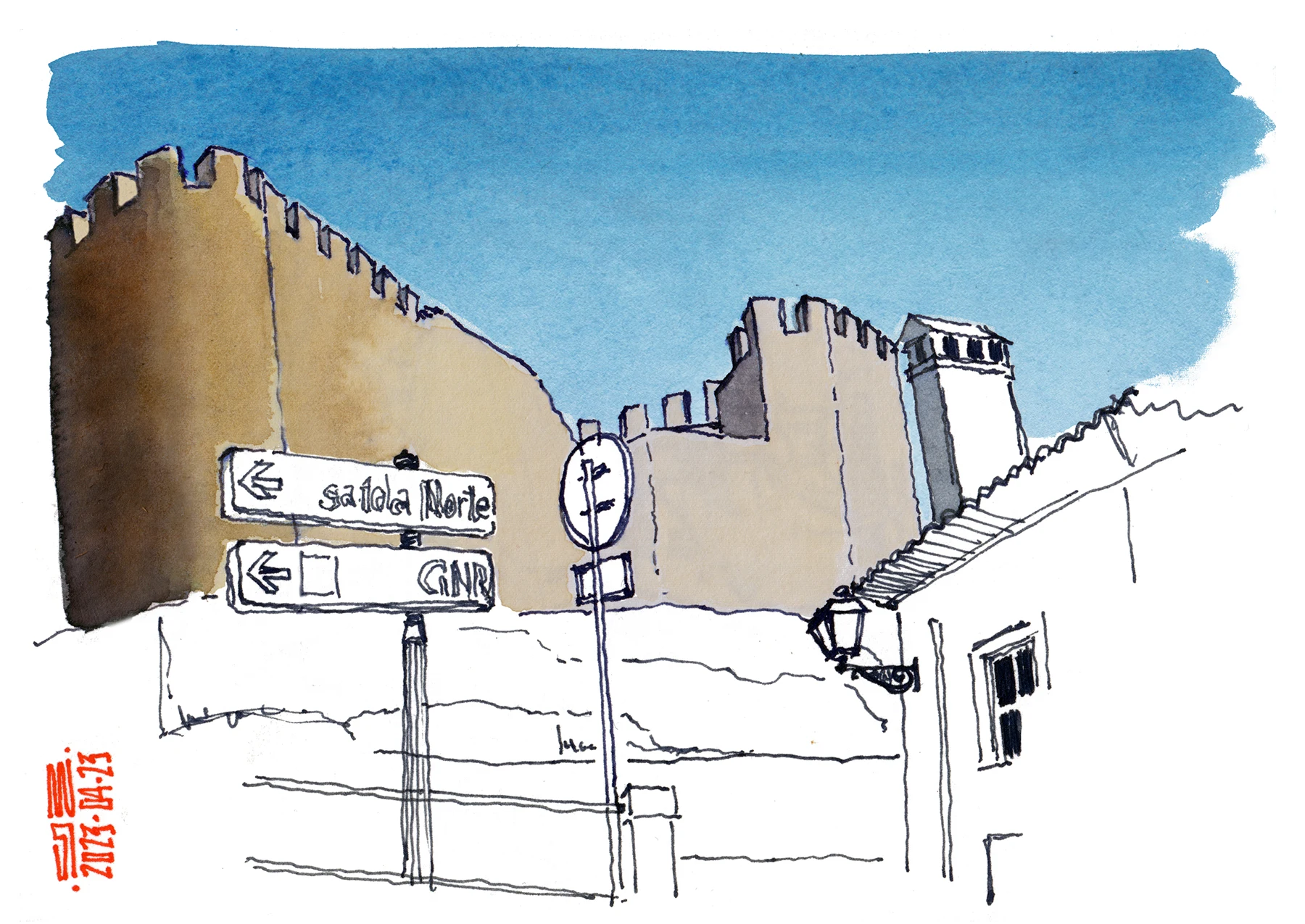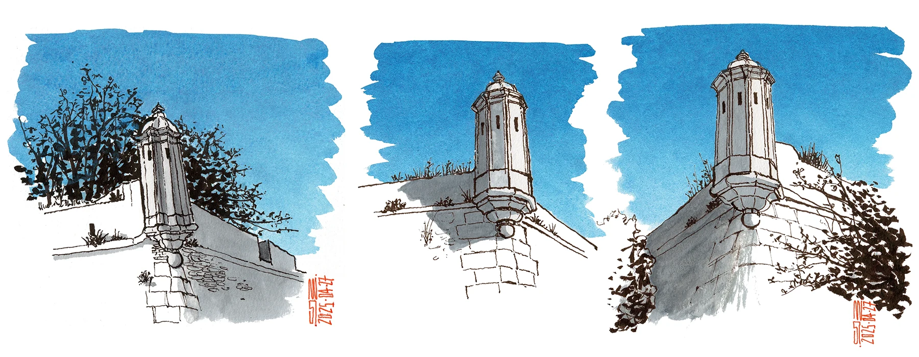 Isolada do contexto urbano, a muralha permite uma leitura mais directa da matéria e da intenção construtiva — a irregularidade das superfícies, as marcas de reparação e a erosão lenta que suaviza as linhas sem as apagar. O desenho procura registar esse diálogo entre geometria e desgaste, onde a arquitectura militar se aproxima de uma forma quase elemental, reduzida à sua essência: conter, delimitar e permanecer.
