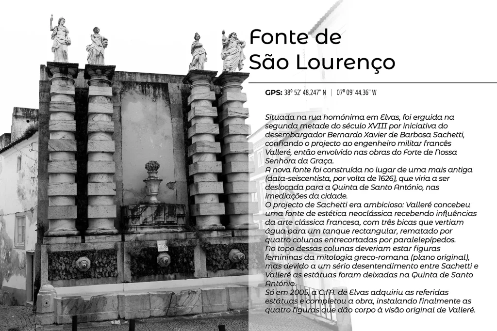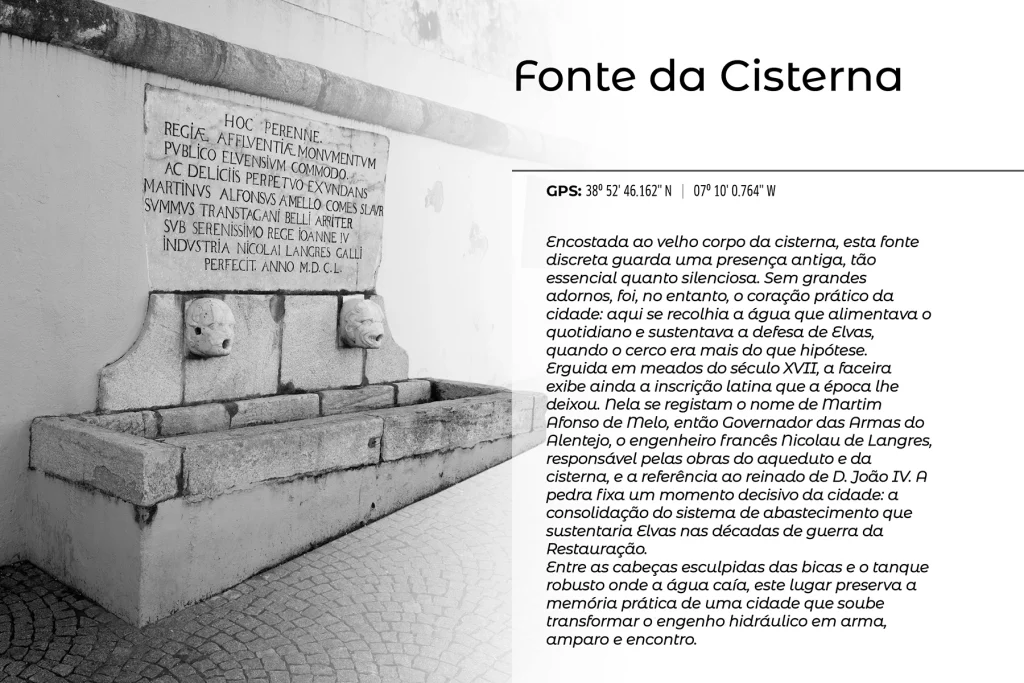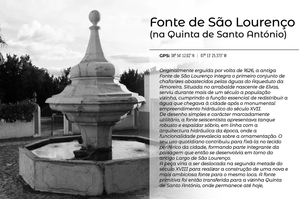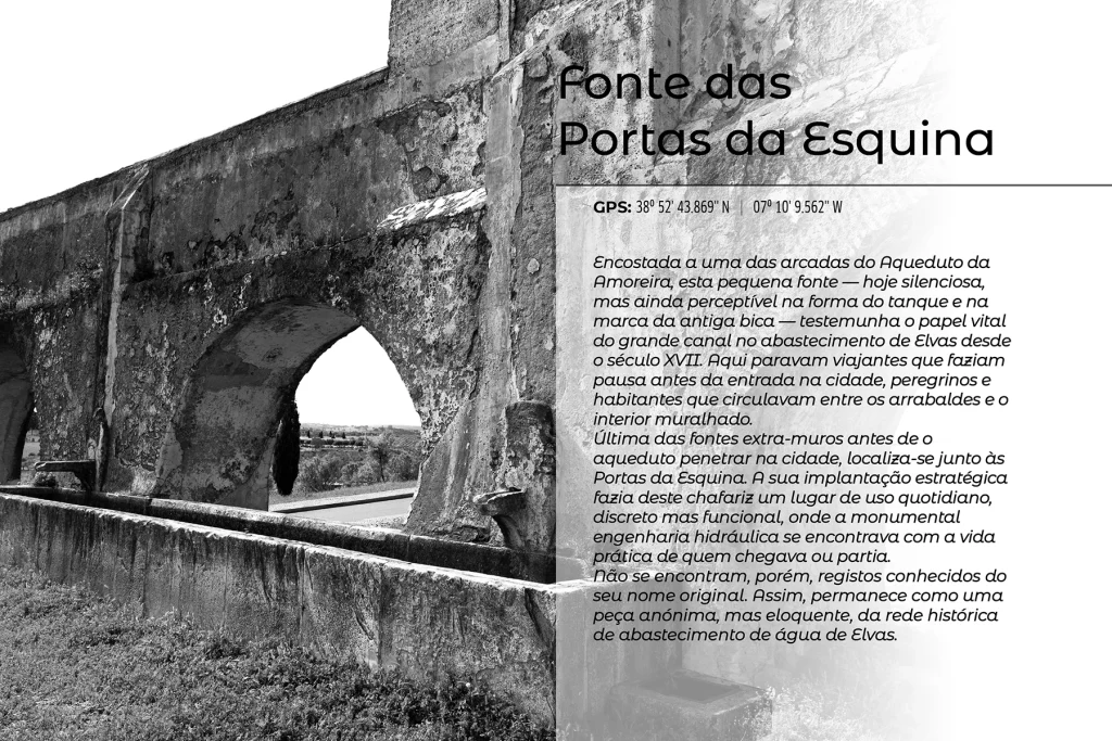 Mas, para além desse eixo maior, o território de Elvas é também marcado por fontes ligadas a nascentes naturais e a pequenos cursos de água, muitas delas situadas fora das muralhas. Estas fontes antecedem o aqueduto ou coexistem com ele, mantendo uma relação direta com o solo, a topografia e os caminhos do campo. São pontos onde a água emerge sem condução prolongada, revelando a proximidade entre terreno, uso e arquitetura.