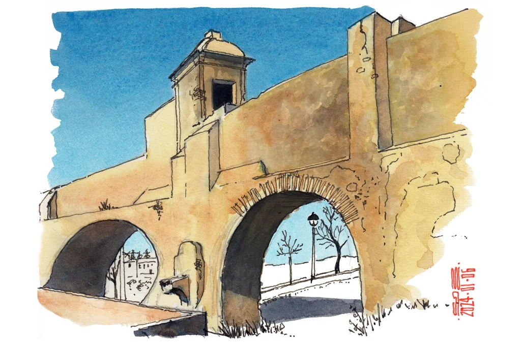 O Aqueduto da Amoreira desenha-se na paisagem como uma linha contínua de pedra, erguida no século XVI para garantir o abastecimento de água à cidade de Elvas. Resultado de um longo processo construtivo que se estendeu por várias décadas, é uma obra de engenharia notável, onde a necessidade prática deu origem a uma forma de grande clareza e permanência. Os seus arcos sucedem-se com ritmo regular, impondo uma ordem serena ao território. A pedra, trabalhada para resistir ao tempo, conserva as marcas do esforço coletivo e do conhecimento técnico que permitiu conduzir a água desde as nascentes até ao coração urbano.