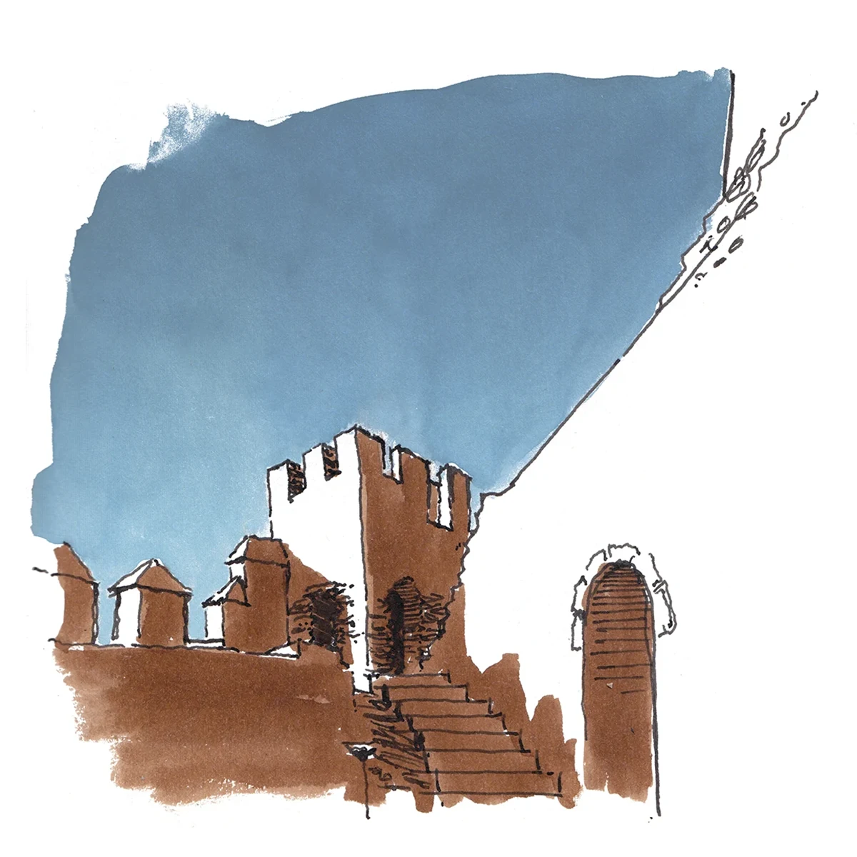 Observada de perto, a muralha expõe a materialidade do tempo: panos irregulares, remates interrompidos, juntas e reparações que denunciam diferentes fases construtivas. O desenho procura isolar essa estrutura do contexto envolvente, registando a fortificação como corpo autónomo, onde a severidade defensiva convive com subtis sinais do vocabulário manuelino — não como ornamento pleno, mas como marca histórica inscrita na própria matéria da pedra.